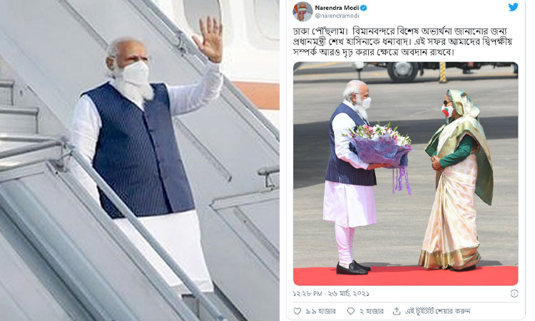ঢাকায় নেমে নরেন্দ্র মোদি বাংলায় টুইট করেন। সেখানে তিনি বলেন, ‘ঢাকা পৌঁছলাম। বিমানবন্দরে বিশেষ অভ্যর্থনা জানানোর জন্য প্রধানমন্ত্রী শেখ হাসিনাকে ধন্যবাদ। এই সফর আমাদের দ্বিপক্ষীয় সম্পর্ক আরও দৃঢ় করার ক্ষেত্রে অবদান রাখবে।’